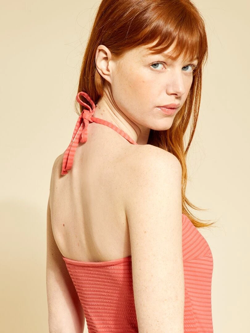 Forma de pico en el escote y punto texturizado, una prenda cómoda y con clase que no puede faltar. Nos encanta su forma bandeau que estiliza los hombros y que te permitirá conseguir el bronceado perfecto.