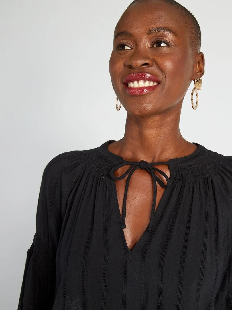 Una blusa de punto texturizado que te conquistará con su efecto alveolado, su material vaporoso y su cinta anudable del cuello.