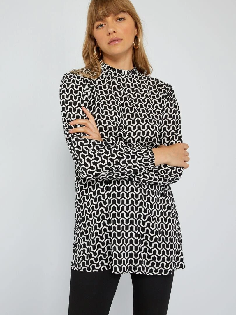 Blusa Estampada De Cuello Alto Con Volante – NEGRO
