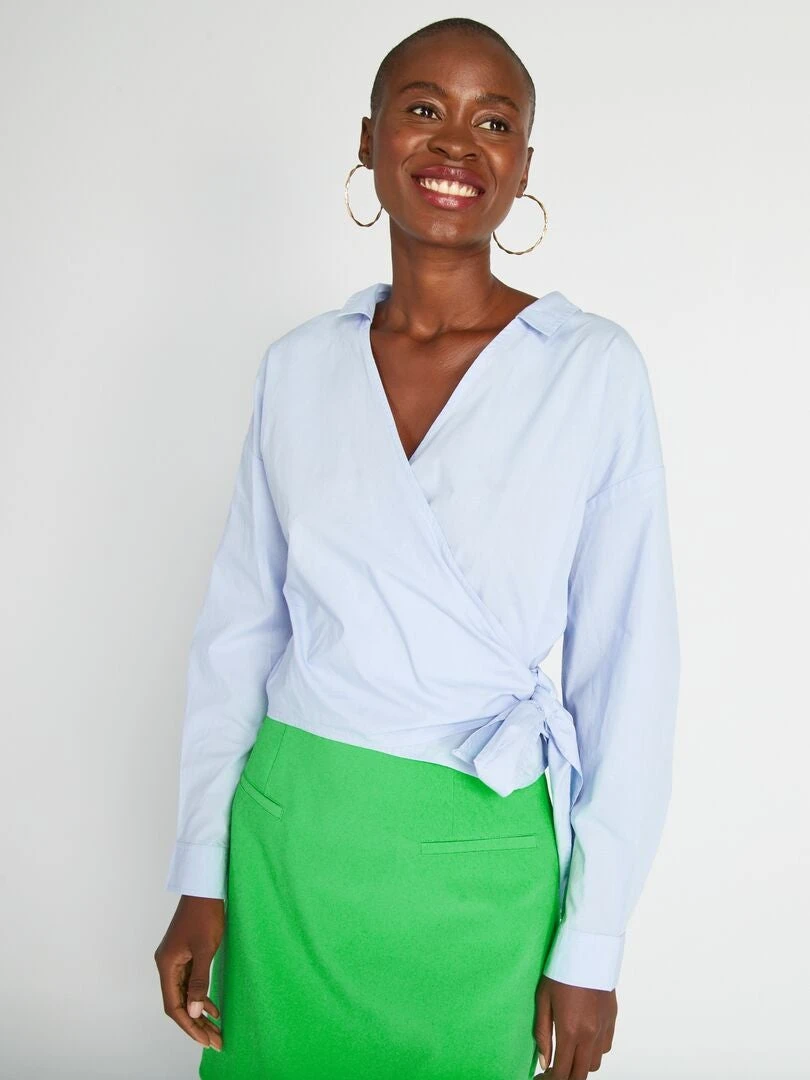 Camisa De Popelina Y Lazo Anudado Por Delante – Azul