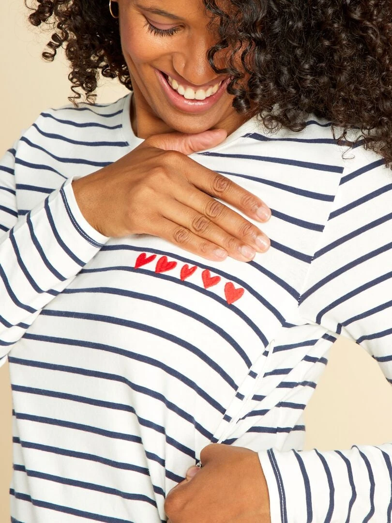 – Motivo de rayas all over + ‘corazones’ bordados en el pecho