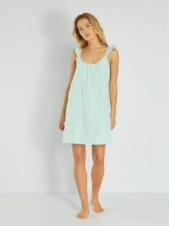 Los tirantes con volantes añaden un toque de feminidad a este camisón, mientras que su forma desenfadada aporta comodidad y libertad de movimientos.