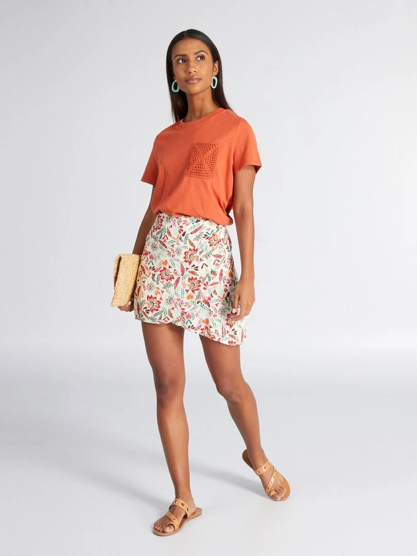 Nos encanta el corte cruzado de esta falda y su precioso estampado de flores.