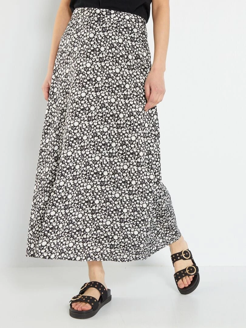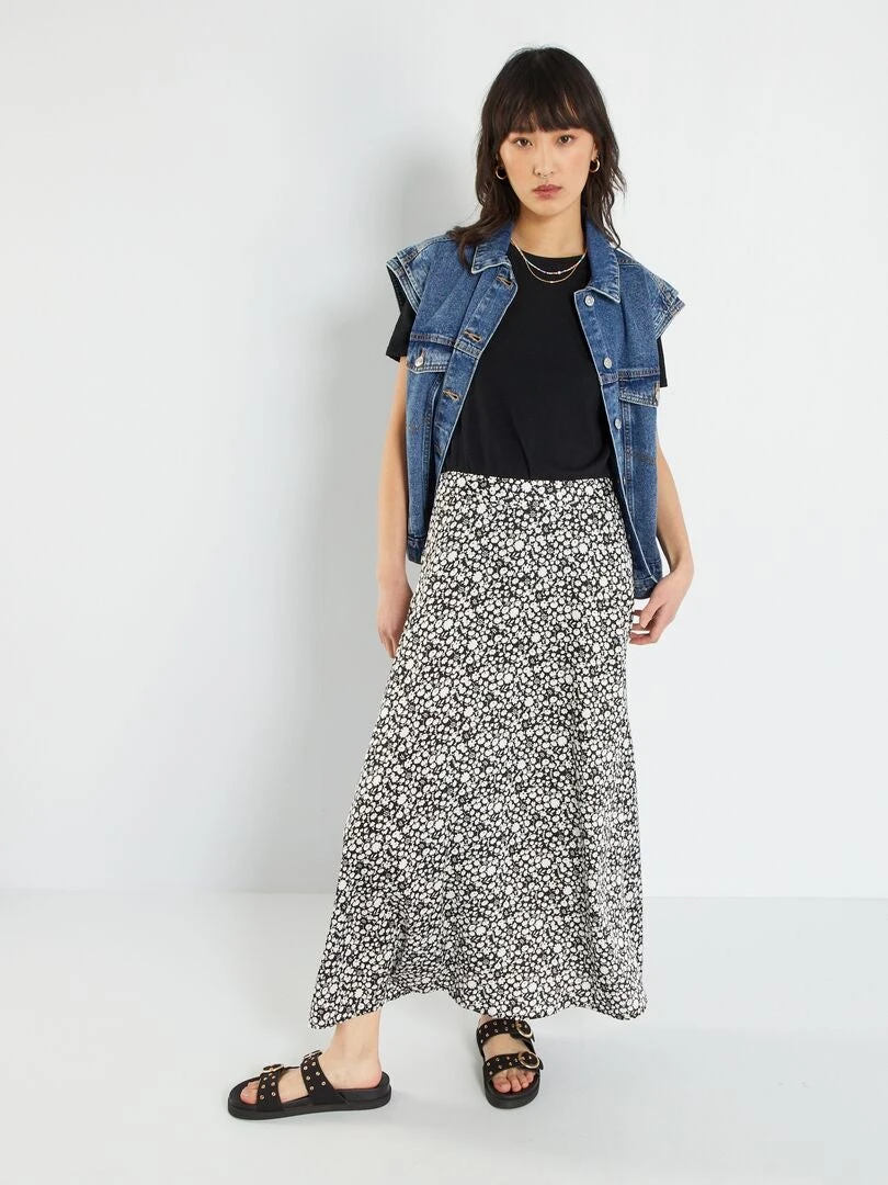 Una falda con mucha clase gracias a su corte evasé y su tejido satinado. Está compuesta de poliéster reciclado, perfecto para la moda y el medioambiente 😉