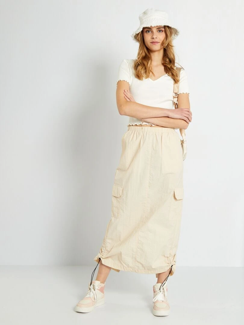 Una falda larga de tejido parachute, una prenda a la última que no puede faltar en el armario.