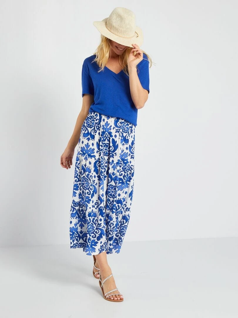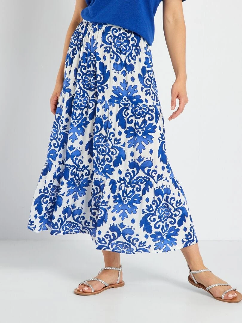 Descubre nuestra falda evasé midi con estampado de flores, símbolo de feminidad y ligereza. Gracias a su motivo floral de colores y su tejido vaporoso, se convertirá en tu aliada perfecta para el buen tiempo. Le dará un toque de frescor y elegancia a tus looks, ya sea para una salida desenfadada, una fiesta o un evento especial.