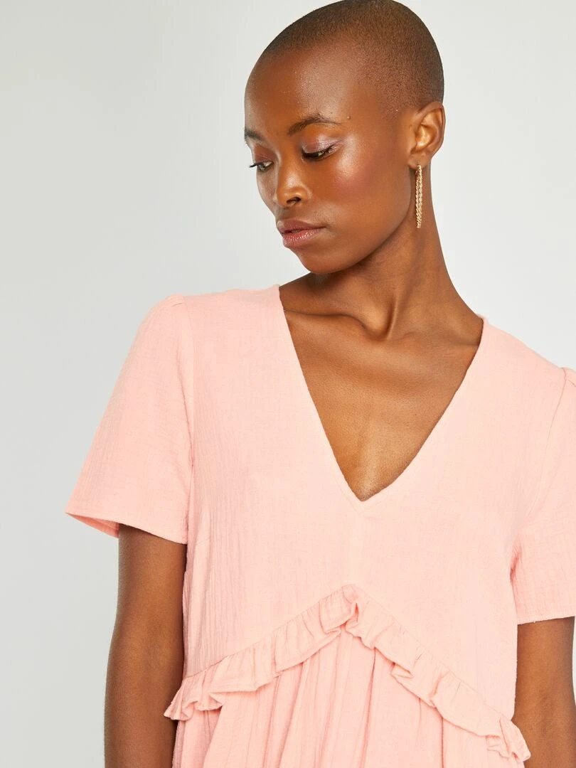 Este vestido ligero de gasa de algodón te conquistará. Cuenta con un precioso volante en la parte delantera.