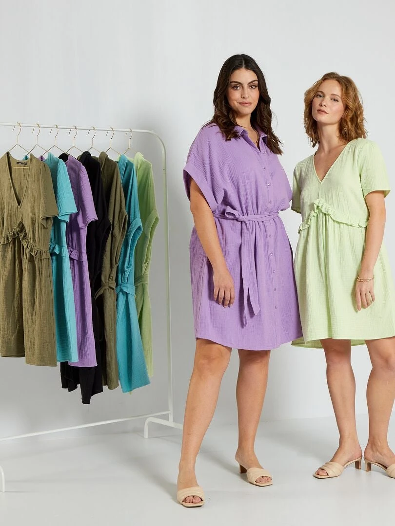 Este vestido ligero de gasa de algodón te conquistará. Cuenta con un precioso volante en la parte delantera.