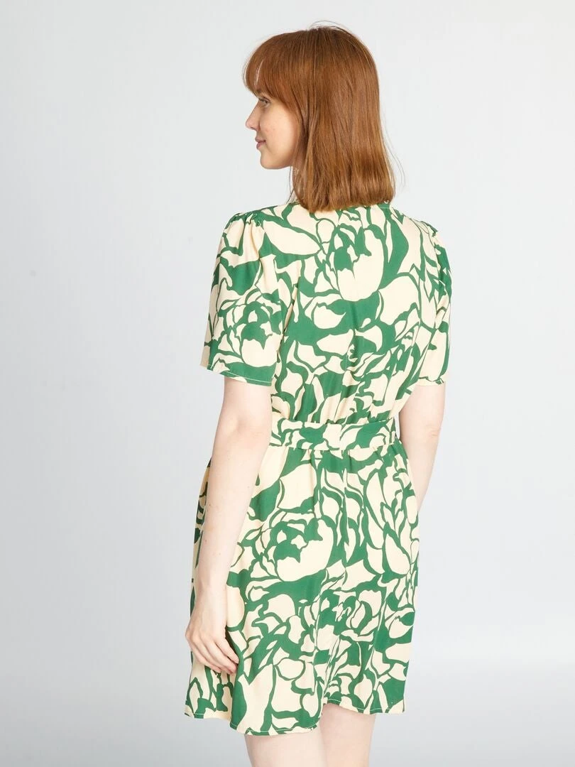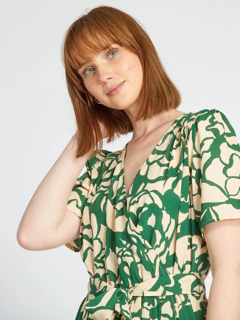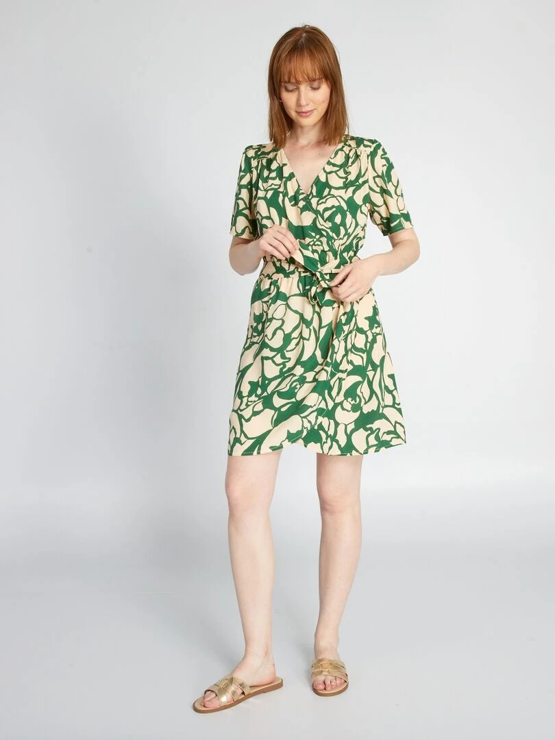 Este vestido estilizará tu figura gracias a un bonito cuello cruzado y un motivo floral.