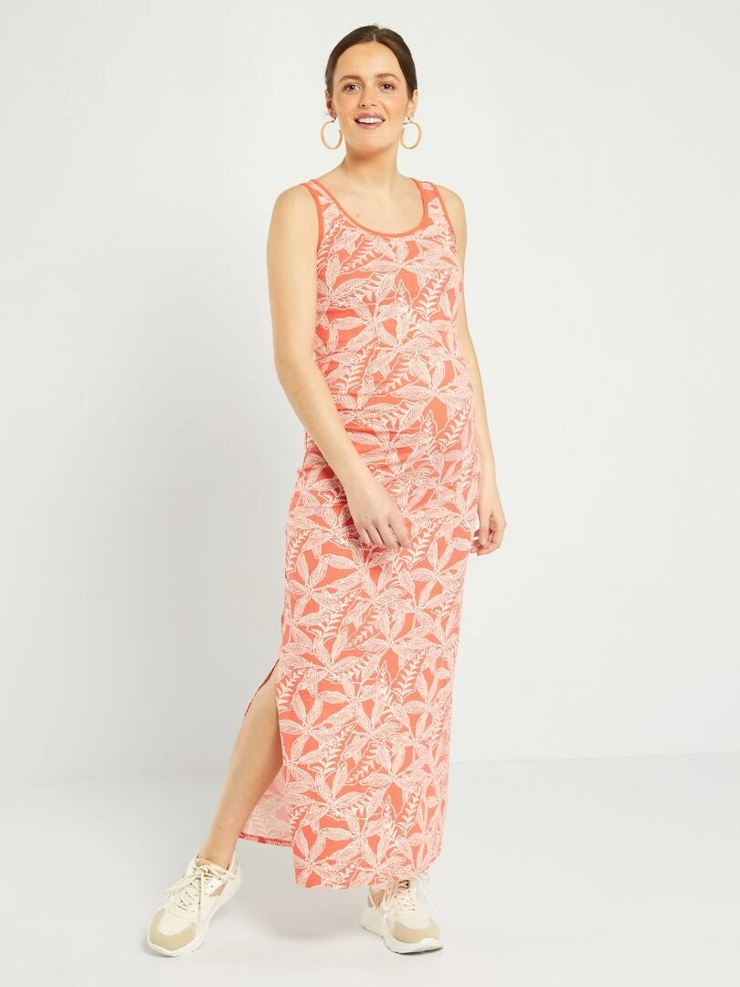 Un vestido de verano perfecto para futuras mamás. – Vestido largo – Premamá – Corte recto – Algodón elástico – Cuello redondo – Tirantes anchos – Largo parte trasera: 133 cm aproximadamente – Nuestra modelo lleva una talla S y mide 1,73 m
